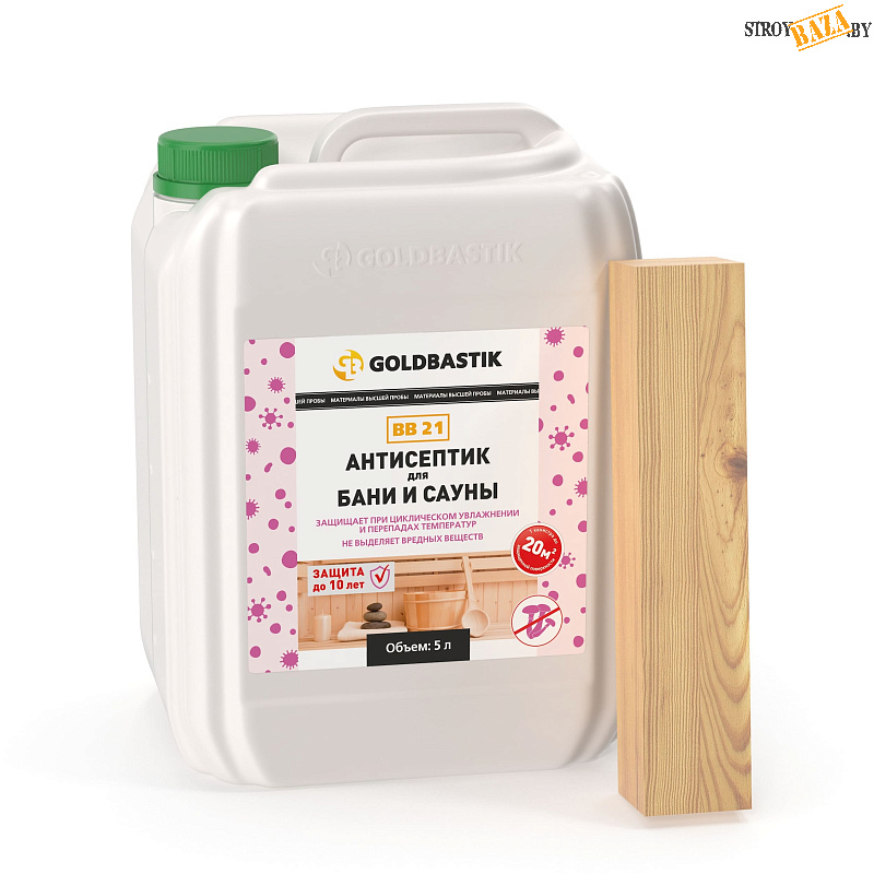 GOLDBASTIK BB 21 — антисептик на водной основе для бань и саун. Предназначен для защиты древесины от действия дереворазрушающих и деревоокрашивающих плесневых грибов в саунах, парных, моечных и прилегающих к ним помещениях. Содержит компонент, предотвращающий развитие болезнетворных микробов, спор грибков. Обеспечивает надежную защиту при циклическом увлажнении и перепадах температур. Способен как предотвращать биопоражение, так и останавливать уже начавшиеся процессы поражения древесины биологическими агентами. Древесина при необходимости легко пропитывается маслами для саун, окрашивается и тонируется. Не изменяет естественный аромат и структуру древесины.