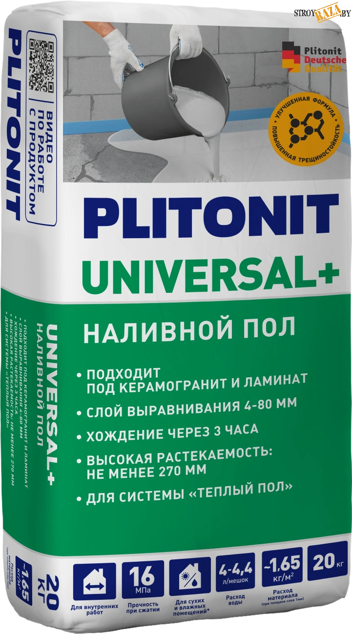 PLITONIT Universal + — это сухая смесь на минеральной основе (гипсовые вяжущие, портландцемент, модифицирующие добавки) для устройства высококачественных выравнивающих слоев пола внутри помещений . Материал соответствует требованиям ГОСТ 31358-2019 .
